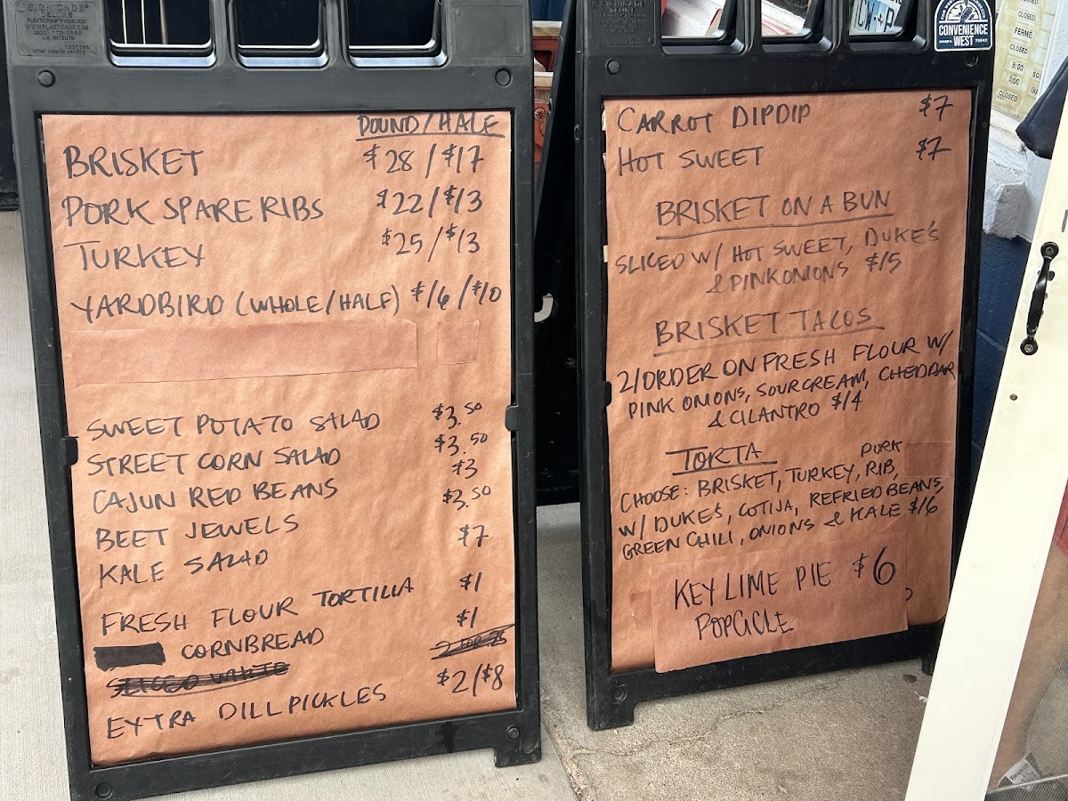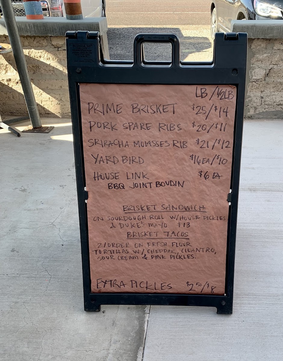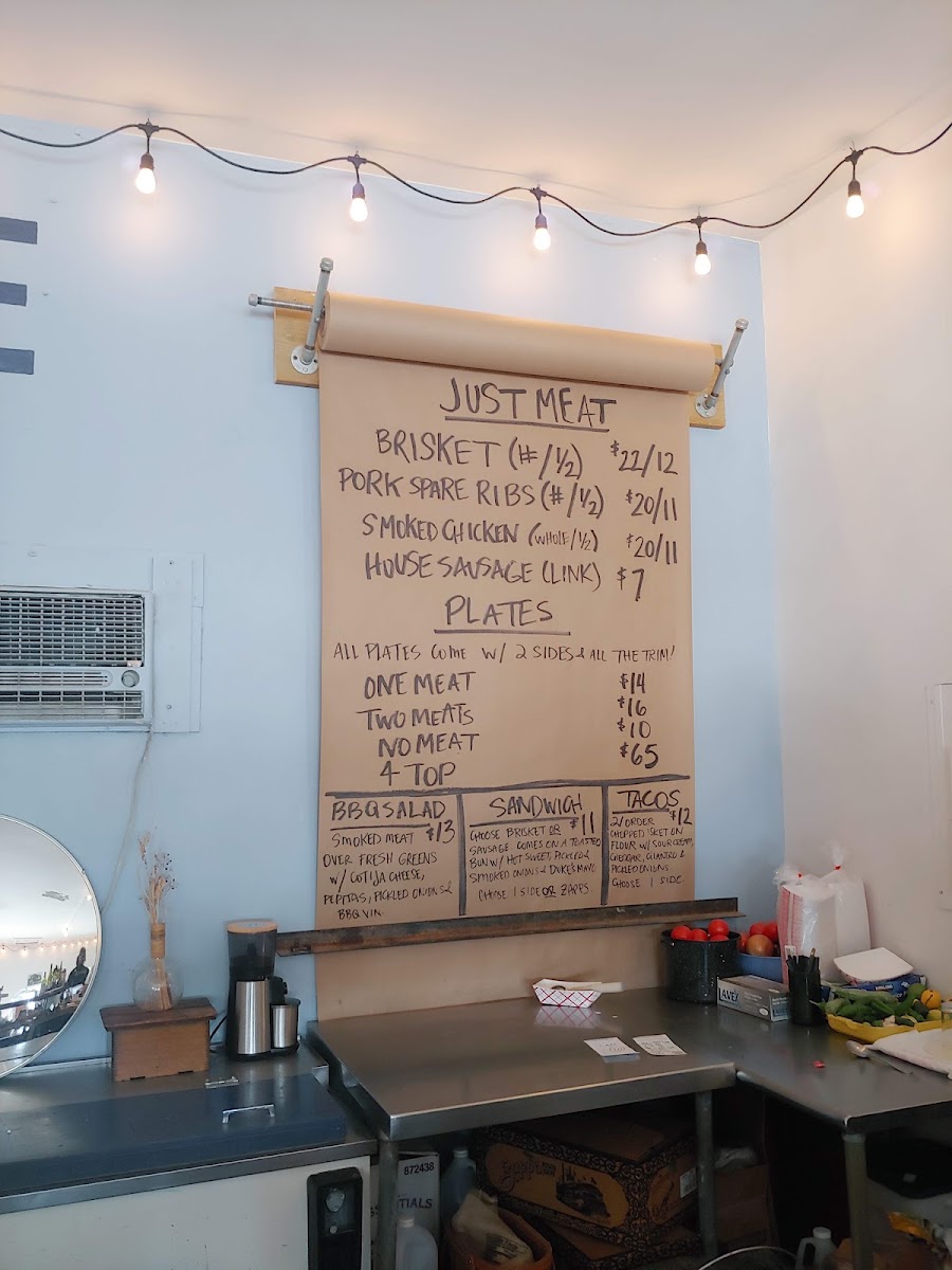 The menu reads like a focused celebration of Texas barbecue, where smoke, simplicity, and hearty portions define the experience. Dishes such as Pork Spare Ribs Turkey and Sweet Potato Salad and Pork Ribs Pickles and Carrot Coleslaw balance richness with freshness, using crisp sides to cut through deep, slow-cooked flavors. Beef lovers are especially well served: Brisket Tacos, the Brisket Sandwich, Beef Rib, and the standout Prime Brisket Plate with Asadero Sausage showcase tender meat, confident seasoning, and a clear respect for traditional barbecue technique. Plates like the 3 Meat Plate allow diners to sample across the menu, while Pulled Pork delivers the expected comfort and smoky pull that defines the genre. For something lighter but still satisfying, the Tri Tip Salad and Chicken Potato Salad offer protein-forward options without losing the restaurant’s rustic identity. Breakfast-style comfort appears in Sausage Biscuits, reinforcing the all-day appeal of the menu. Drinks such as Beer fit naturally into the casual, communal vibe, while Cobbler provides a warm, nostalgic finish that feels earned after a meat-heavy spread. Overall, the menu feels intentional and cohesive, favoring well-executed classics over excess, and leaving a strong impression of a kitchen that knows exactly what it wants to serve and how its guests want to feel while eating it.